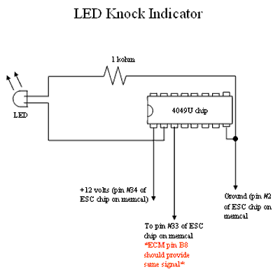 On the memcal, you will find a goop covered board that is the ESC chip. The connections between the 4049U chip and the car is all made through the pins on this chip. Well call the chip a 34 pin chip. The dimple to indicate pin 1 is nearest the PROM. On the LED there will be one side that is flat. The flat side gets connected to the resistor.